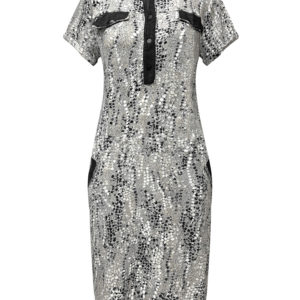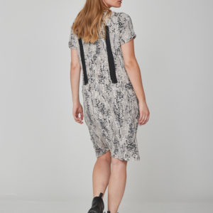 Printet kjole med rå designdetaljer som “fake” brystlommer med trykknap og 2 sidelommer med rå lynlås markeret med sort stof. Stolpelukning ligeledes markeret med sort og trykknapper samt snoretræk. Materialet er ren bomuld og dejlig blød som joggingstof. Style den evt. med et par stramme bukser indunder eller dress den op med en blazer. Kjolen kan bruges både til hverdag eller fest.