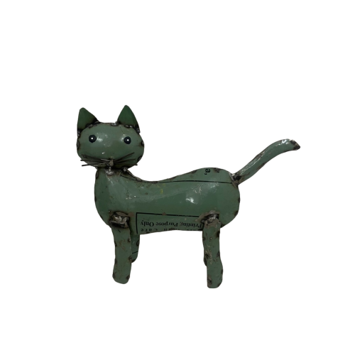Katten er lavet af recycled metal og måler ca. 25 cm i højden og 25,5 cm i længden.