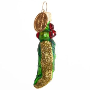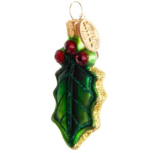 Kristtjørn blad som julepynt i 4 cm. Den elegante Kristtjørn i mundblæst glas, smukt hånddekoreret og særligt pyntet med små røde rhinsten diamanter.