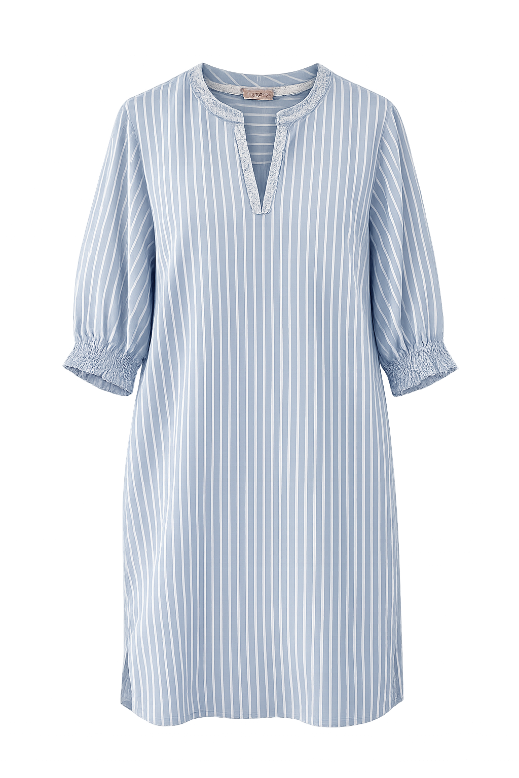 Let og luftig bomuldskjole i lyseblå med striber og de fineste broderier på krave og halsåbning. Ærmerne er afsluttet med en smock elastik, så kan du selv bestemme om du vil lave lidt puf effekt, ved at skubbe ærmet op.