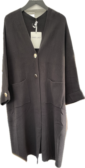 Lang sort cardigan med 2 gode lommer og store guldknapper. Modellen er meget rummelig og dejlig tyk.