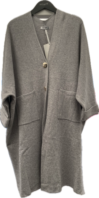 Lang grå cardigan med 2 gode lommer og store guldknapper. Modellen er meget rummelig og dejlig tyk.