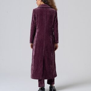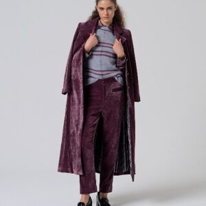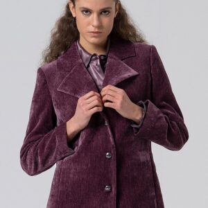 Gudeskøn velourjakke med et super flot snit i en smuk blomme farve. Jakken er figursyet og er pyntet med meget dekorative knapper og har lommer i begge sider. Hele herligheden prydes med et let vateret inder foer i striber, som matcher jakkefarven.