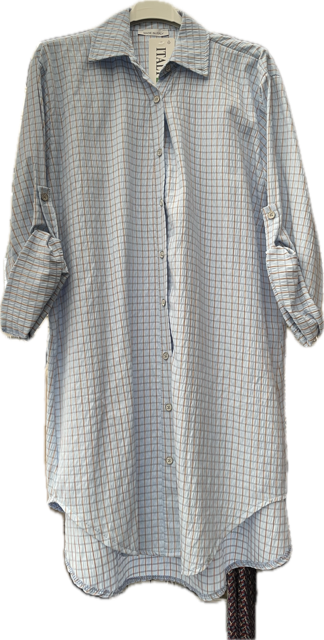 Rummelig lang ternet skjorte med glimmerknapper. Modellen er rundskåret og perfekt over et par jeans eller åbenstående over en lang kjole.