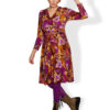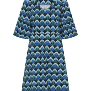 Super flot kjole i et fantastisk blåt og grønt grafisk print hvor halsudskæringen er rund og har ombukket krave pyntet med knap. Kjolen har god A-facon og 3/4 ærmer som ender ud i trompet. Kjolen er skåret i taljen og har lommer i siden.