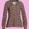 Flot bluse med bomber i grøn og blå med en ombukket halskant, som er pyntet med blomsterspænde som pynt. Ærmer er rynket let til manchet.