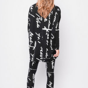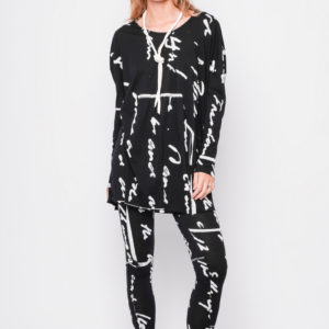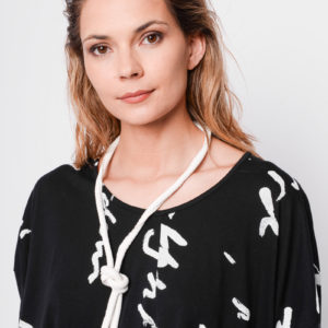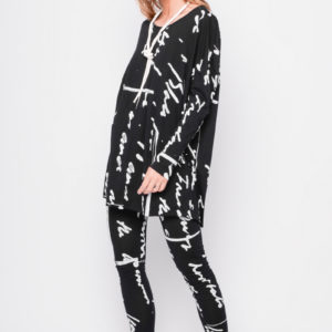 Lang bluse i spændende grafisk print med asymetriske skæringer. Blusen er meget rummelig og har rund hals med smalt kantebånd og har dropshoulder ærmer. Blusen har rå ærmekanter og forneden.