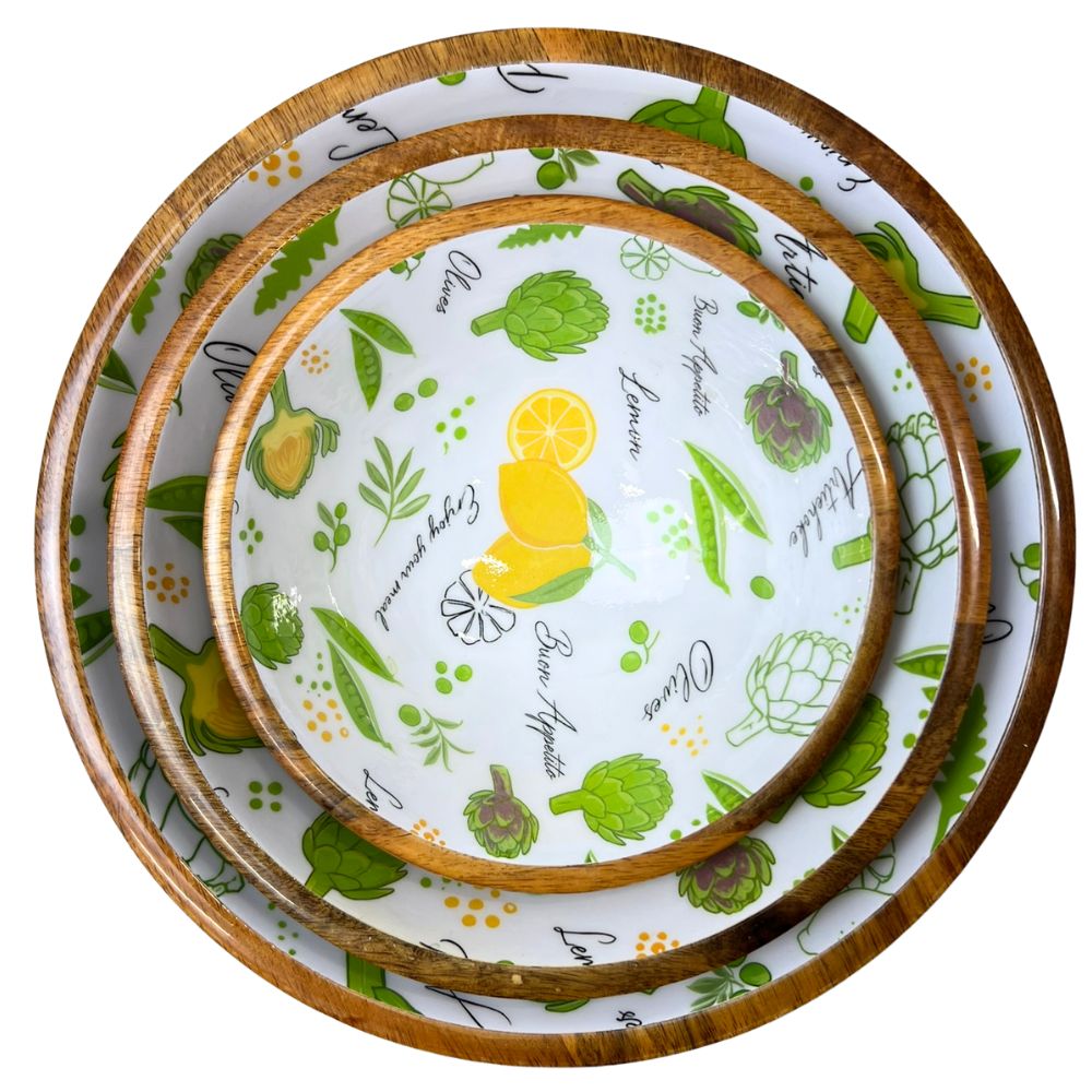 Mango skåle 3 stk. i sæt med grøntsager og citroner der kan bruges til salat, chips, pasta eller dekoration, da de med deres smukke mønstre er dekorative i sig selv