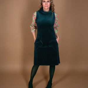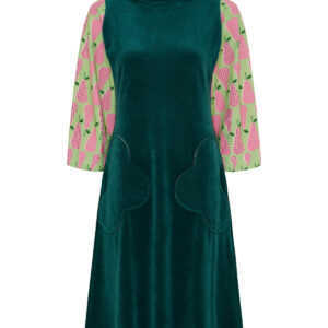 Mørkegrøn velourkjole med kontrast ærmer i fint pæreprint o lysegrøn og pink. Lommerne i siden er skåret som blomster med pippingkant i samme materiale som ærmerne. Modellen har høj bød krave som nemt kan ombukkes.