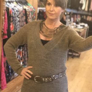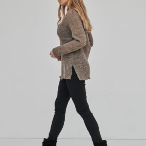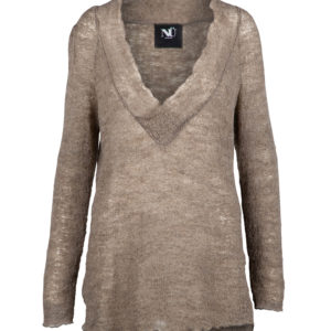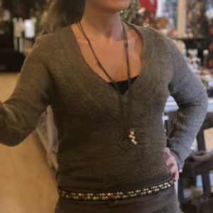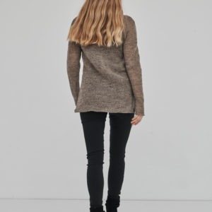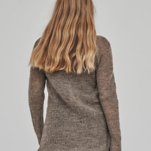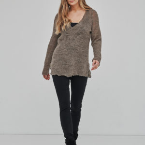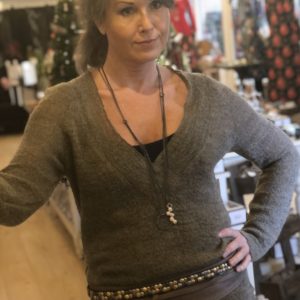 Skøn ulden bluse med bred og dyb V-hals og raglan ærmer. Modellen har slids i siderne samt pynte-lock som kant afslutning.