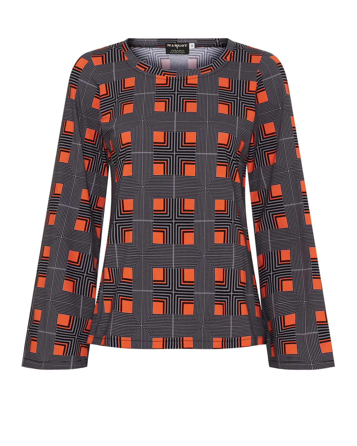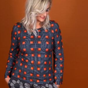 Lækker blød shirt med grafisk print i orange/grå og sort. Ærmerne ender ud i en meget let trompet og shirten bliver dermed meget mere eksklusiv. Style den fx med bukserne Dusky for et afslappet udtryk eller med nederdelen Nightfall for et mere festligt outfit.