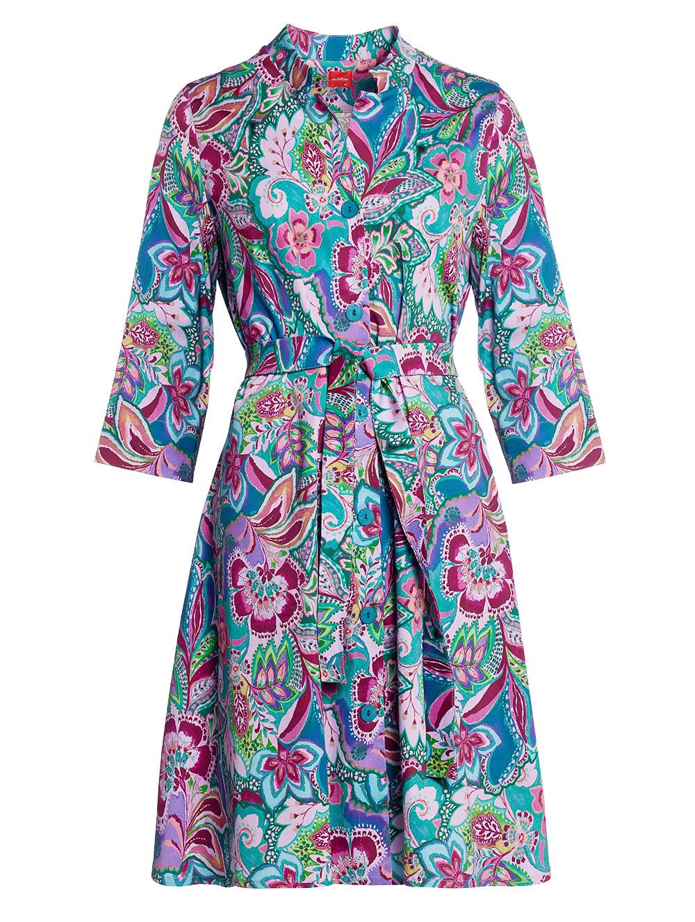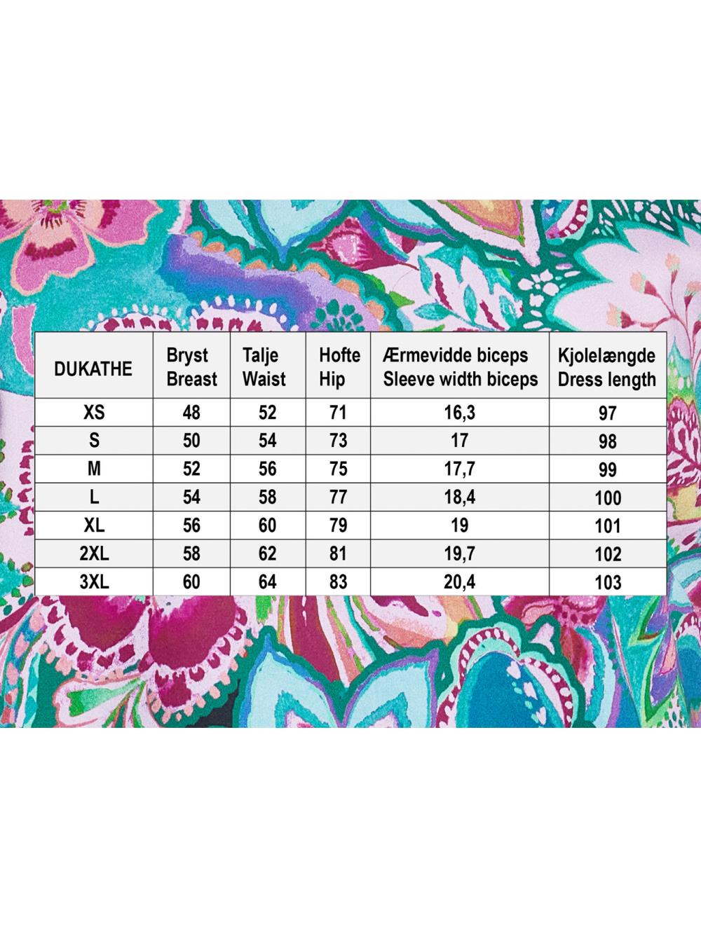 Fantastisk flot print i alverdens farver. Kjolen er gennemknappet og har lommer i siden og har ekstra god vidde forneden. Man kan lukke den med et bælte, som også kan bruges som hårbånd.  Du kan også bruge den som jakke udover andre kjoler eller til bukser.