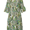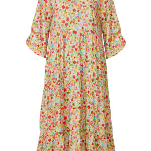 Skøn kjole som er syet i etager, der giver en ekstra vidde fra brystoverskæring og nedefter, hvilket gør at den falder smukt og let om kroppen. Kjolen er syet i 100% viscose crepe i et fint blomsterprint. Kjolen har let rundhals og 3/4 ærmer og der er stiklommer i sidesøm.