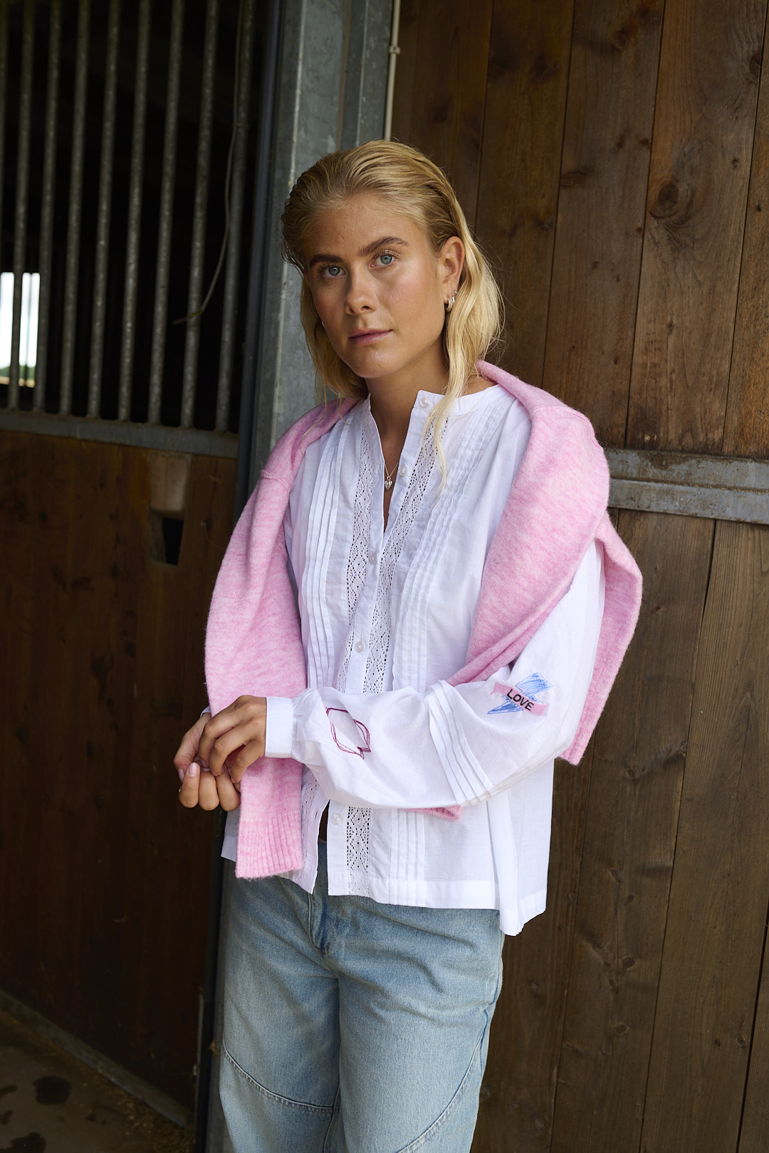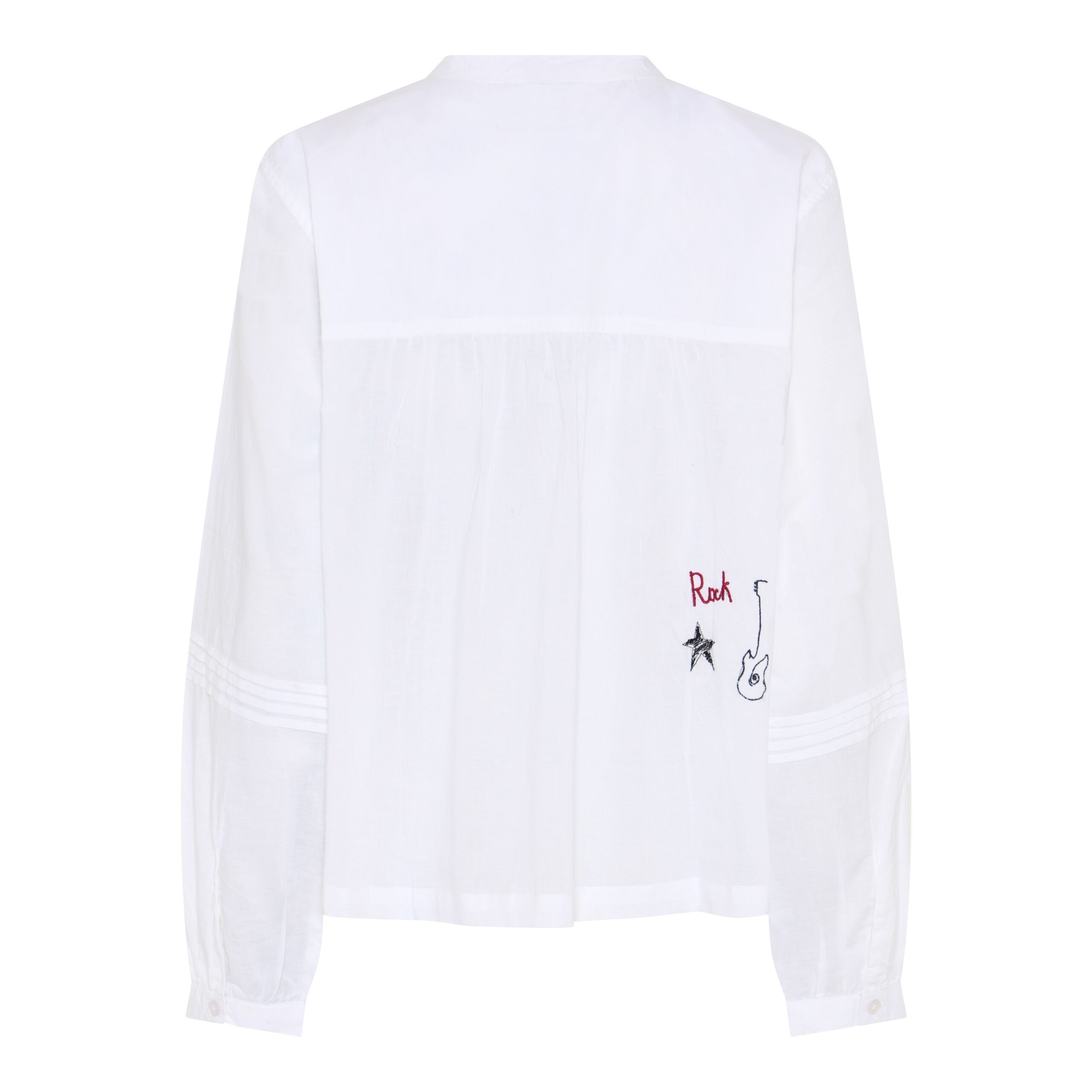 Flot hvid skjorte med broderier på ærmer og bag på ryggen. Modellen har kinakrave og er gennemknappet. Foran er den dekoreret med broderie Anglaise og de fineste bisser der også er på ærmerne. Modellen er meget rummelig.