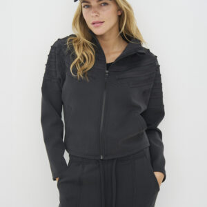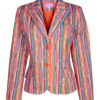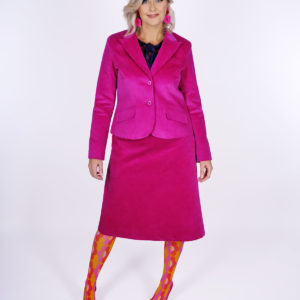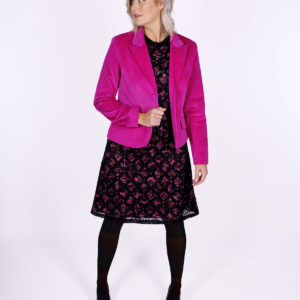 Figursyet pink blazerjakke i fløjl. Modellen har revers, lommer med lommeklapper samt brystlomme.