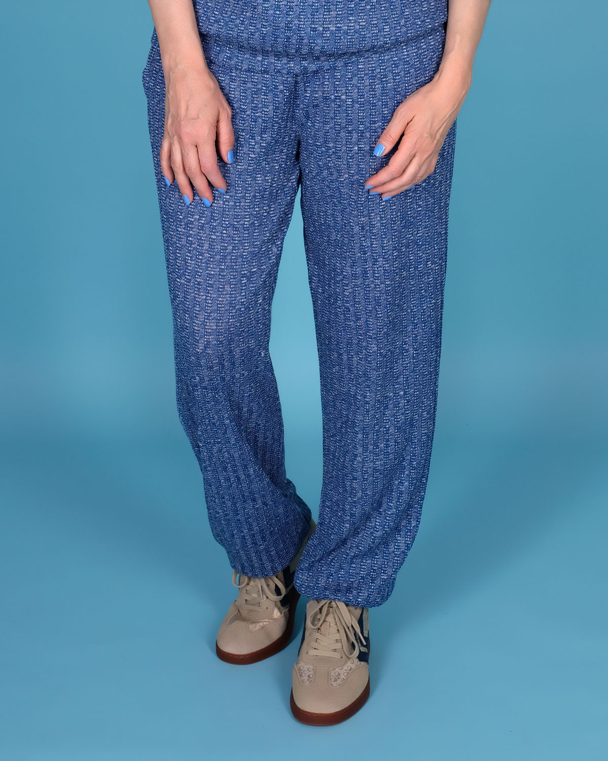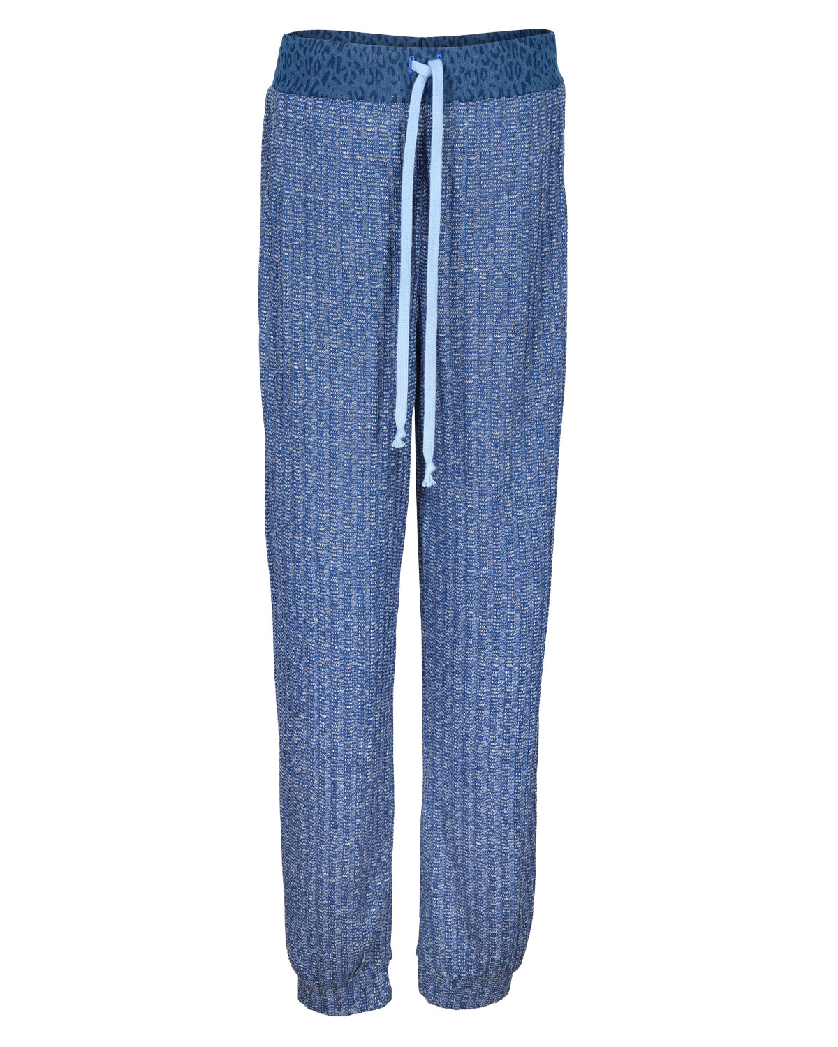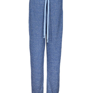 Lækker komfortabel buks i en dejlig blød og blåmeleret strik. Modellen har lommer i siden og et lyseblåt bindebånd i taljen. Som ekstra detalje er linningen i cowboystof med leopard print.