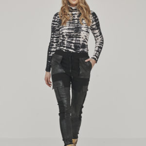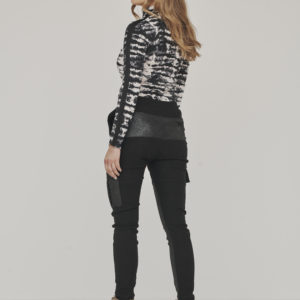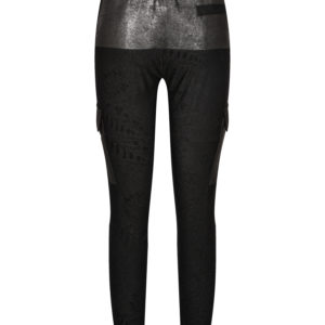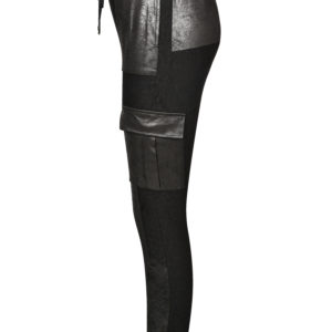 Buksen er i blonde- brokade og masser af stræk og med ” læderlook” forskellige steder og 2 seje lommer foran.