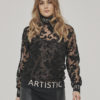 Buksen er i blonde- brokade og masser af stræk og med ” læderlook” forskellige steder og 2 seje lommer foran.