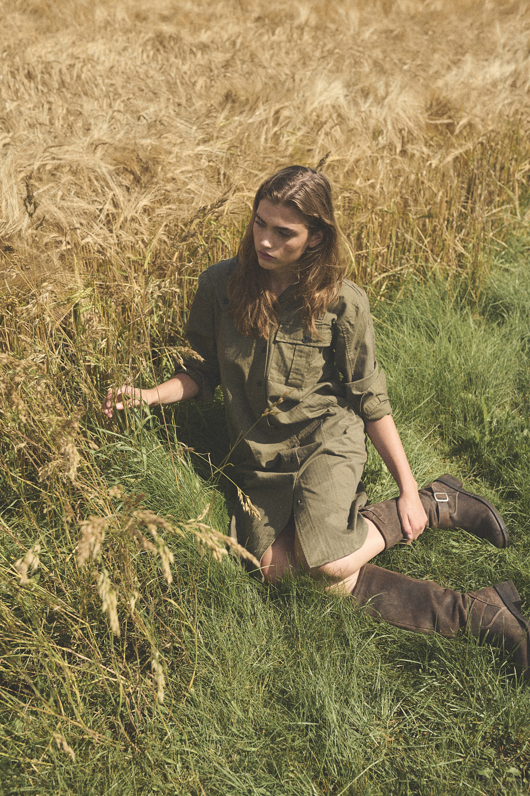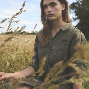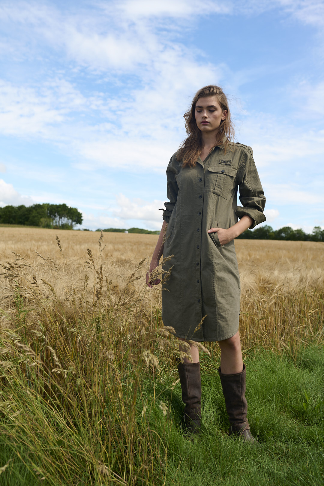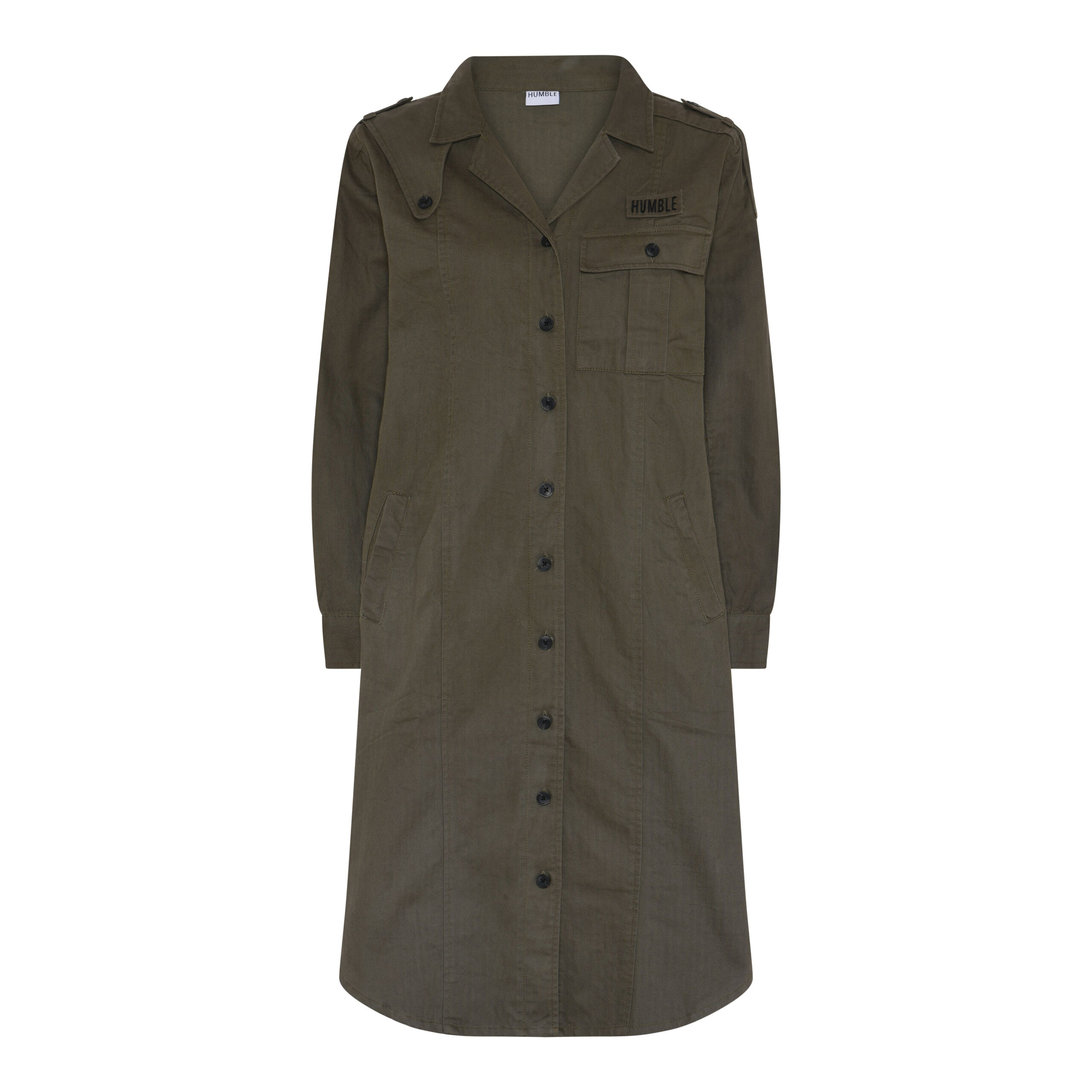 Super flot kjole i sildebens vævet twill i army look som er gennemknappet og har lommer i siden. På skulder sidder der militær stropper og på venstre side er der en lomme med Humble broderi ovenover. Modellen er meget rå og kan også bruges åben som jakke. På ryggen er der et logo broderi med HBS.