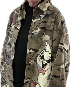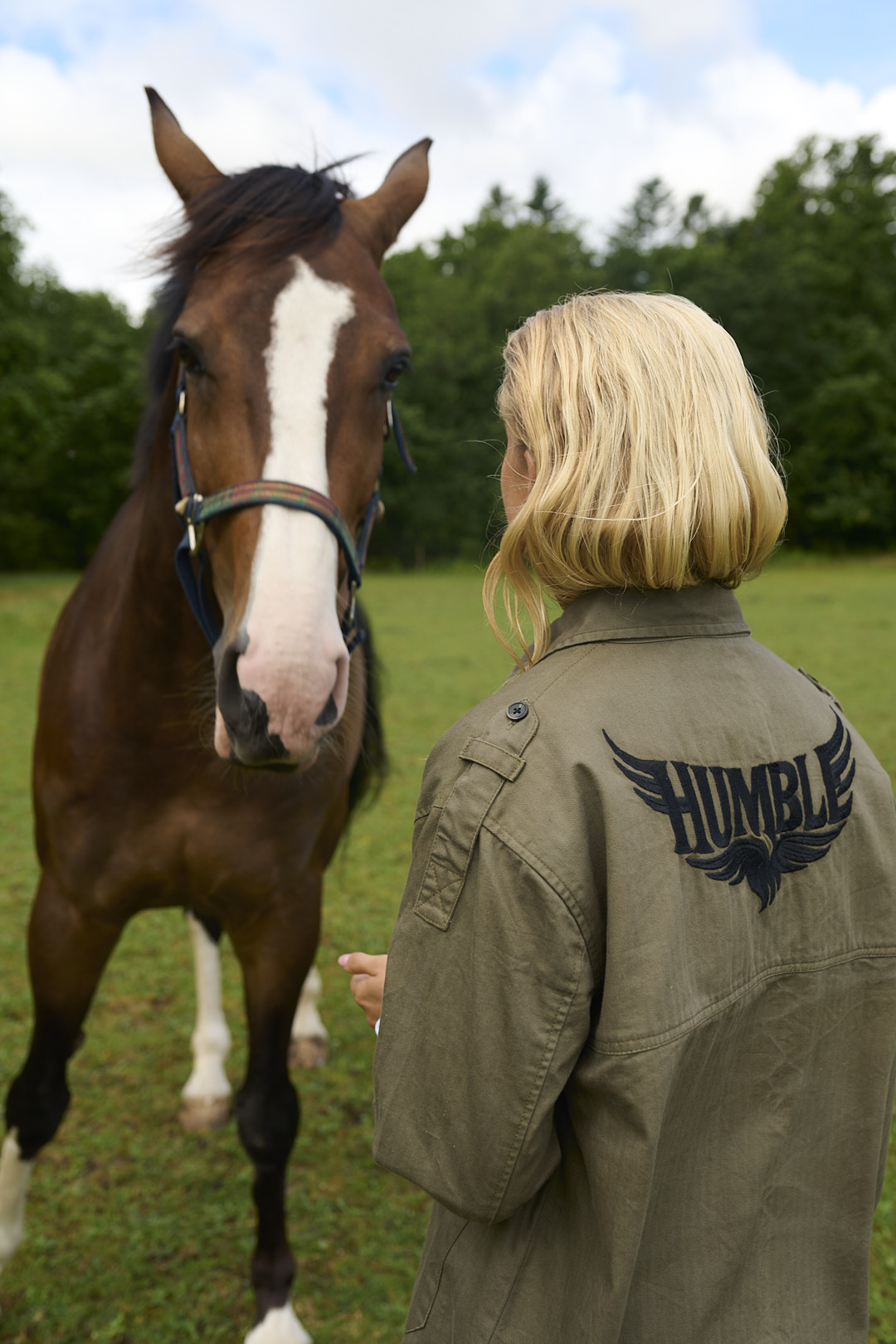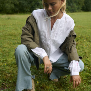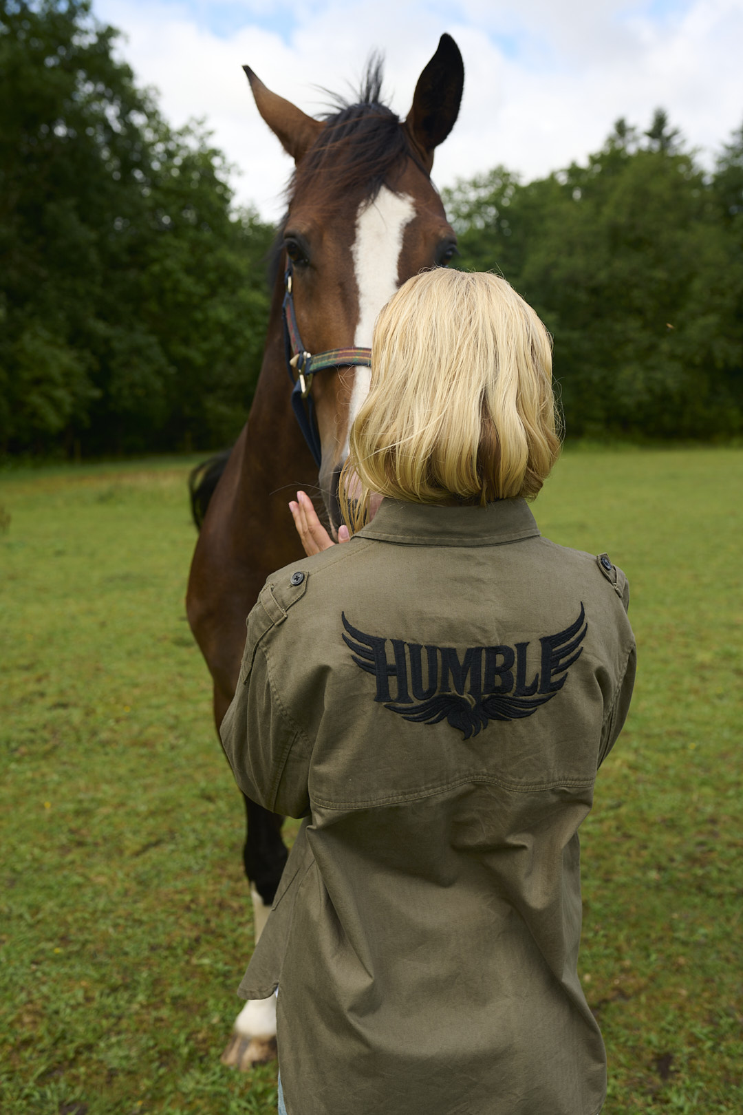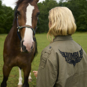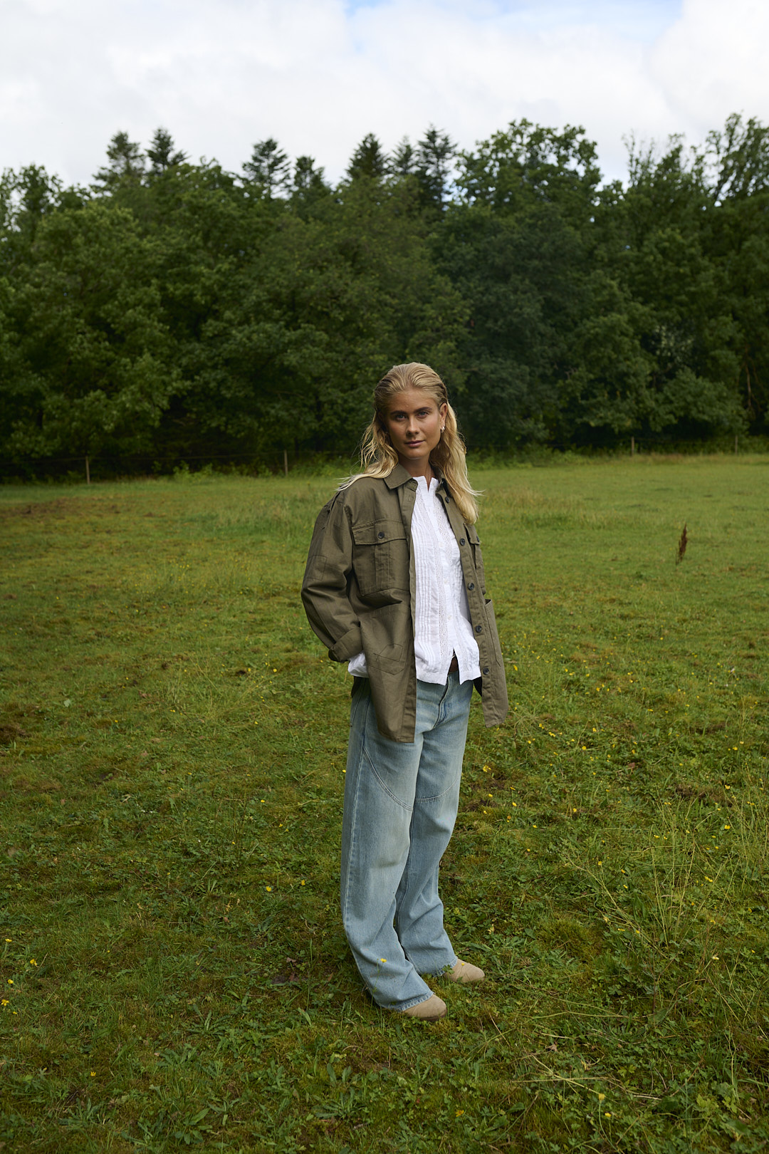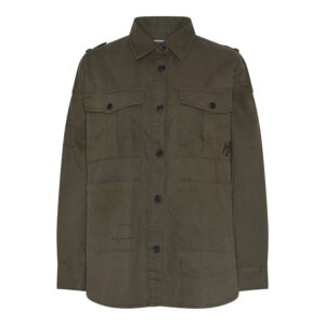 Super flot jakke i sildebens vævet twill i army look som er gennemknappet og har 4 lommer foran. Modellen er rundskåret forneden og har skulderstropper. Bagpå ryggen er der det flotteste broderi med Humble og et lille logo med HBS sidder også foran ved den ene lomme.