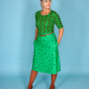Denim nederdel i A-facon – klassisk og alligevel med skønne detaljer. Modellen har fast linning med bæltestropper, lynlås midt for samt slids på 25 cm. Gode skrålommer i siden plus store firkantede påsyede lommer henover sidesømmen, lukket med en metal knap.
