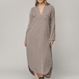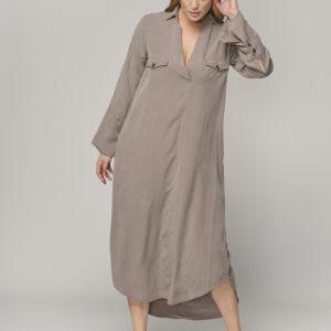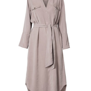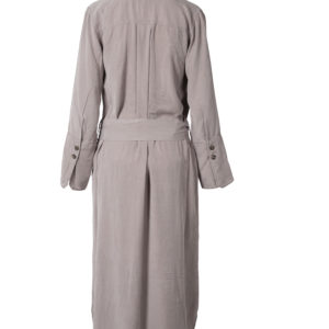 Blød og let kjole i en flot gråbrun nuance som grundet en speciel vask, har silkeblød kvalitet med en løshængende pasform der giver god plads til bevægelse og er ideel til at skabe et afslappet, sommerligt look. Kjolen har et bindebånd, der kan spændes om taljen for at fremhæve din figur og skabe et flot, feminint udtryk. Modellen er rundskåret og slidset i siderne og har 2 dekorative brystlommer. Som ekstra flot design detalje er der lange manchetter på ærmet med 2 knapper
