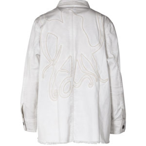 Skøn jeans jakke i cold-dye look med dekorative lommer foran og vertikale overskæringer og rå kantafslutning forneden. Jakken har lommer i siden og en let løs pasform med et unikt mønster af en blæksprutte på ryggen, designet af kunster Sabine Zimmerman med inspiration fra naturen. Modellen har perfekt pasform da der er god stræk. Du kan bruge jakken som både en overgangsjakke eller som en shirt over dit outfit. ( Shirt + Jacket = Shacket).