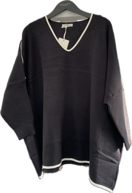 Denne sweater er lavet som en form for poncho og er derfor meget rummelig. Modellen har V-hals og dropshoulder og kontrastkanten fortsætter så fint på overærmet.