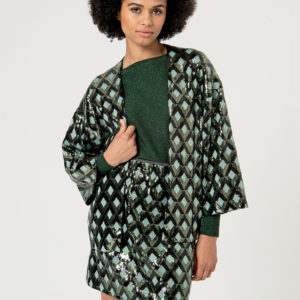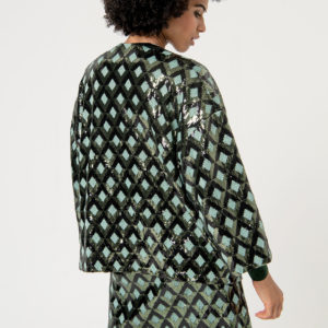 Den smukkeste paillet jakke i grønlige nuancer og sort med god stræk. Det er de gode pailletter som ikke falder af og der er foer i jakken.