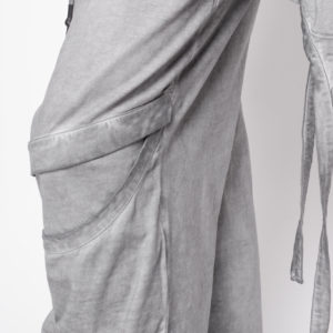 Spændende berber buks med fine detaljer. Buksen har bred linning med bindebånd, lommer i sidesøm og store firkantede lommer bagpå. Hen over knæ er der optiske lommer.