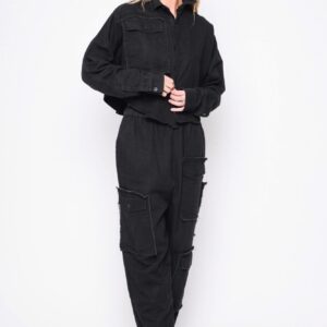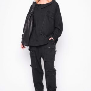 Rå buks i twill-vævet bomuld i let berber stil. Modellen har bred elastik linning med bindebånd og lommer i sidesøm. Store firkantede “lapper” med påsyede lommer med lommeklap og knapper.