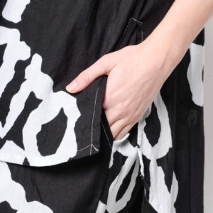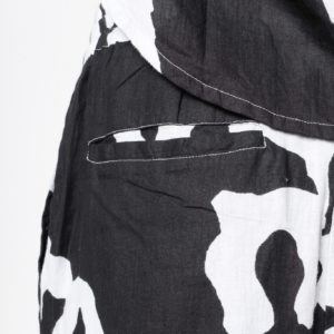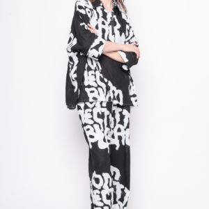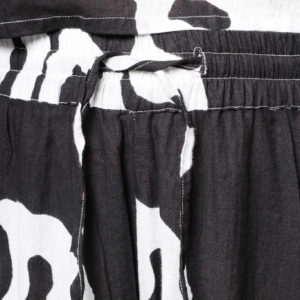 Fantastisk fin buks med brede ben i flot print. Buksen har bred elastik linning med bindebånd, sidelommer og lommer bagpå.
