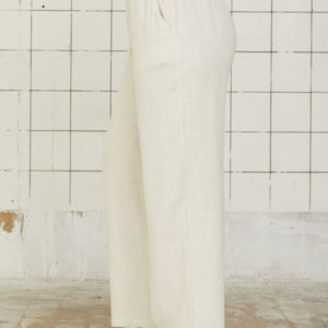 Lækker buks i skønt materiale i afslappet stil. Modellen har fast linning foran og med elastik bagpå samt lommer i sidesøm.