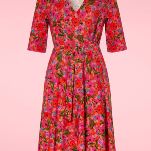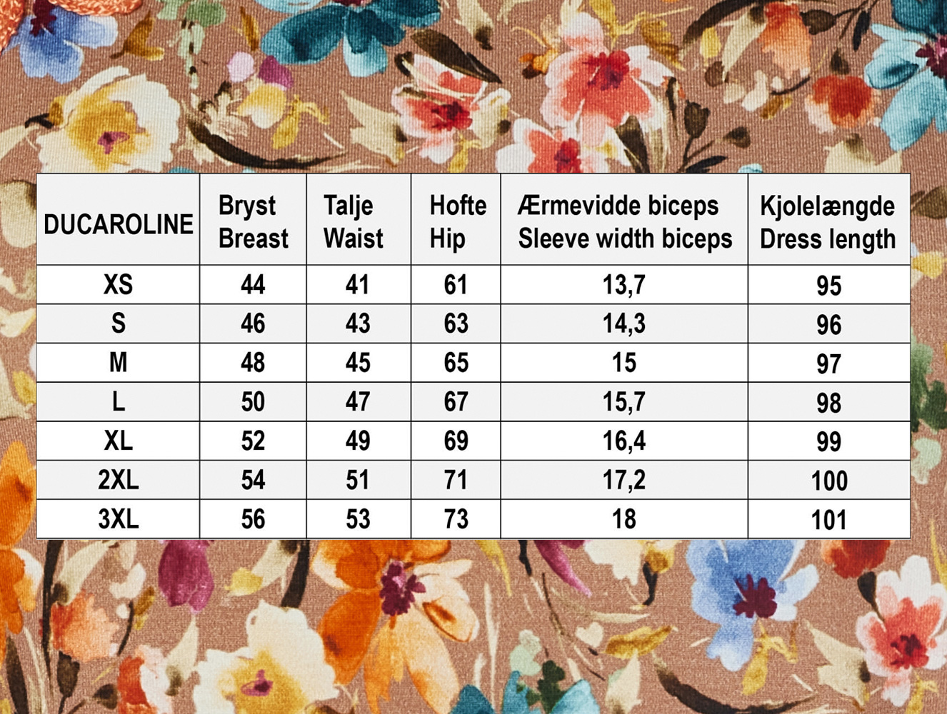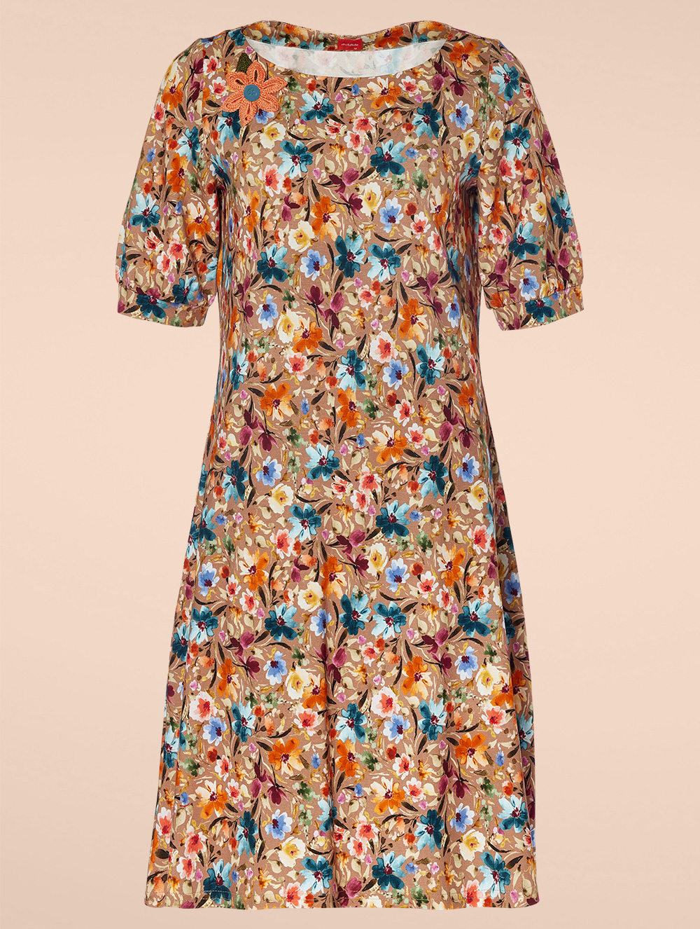 Skøn kjole i den populære duCaroline model, som sidder til over barmen og falder blødt om mave og hofter. Kjolen har korte ærmer med ekstra manchetkant og let puf og modellen er pyntet med 1 flot håndhæklet blomst ved halsudskæringen højre side og har lommer i sidesøm. Mega flot kjole –