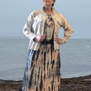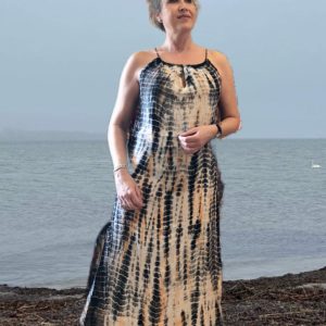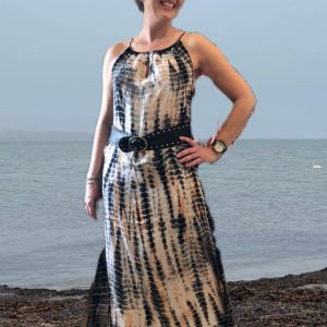 Dejlig luftig og let kjole med et håndlavet tie-dye print som gør at hver enkel kjole er unik. Modellen har V-udskæringer både foran og bagpå og tynde stropper. Kjolen er perfekt til både hverdagsbrug og mere formelle begivenheder, og er nem at style med både sandaler og høje hæle. Med sin lette og luftige kvalitet er den ideel til sommerdage og varme aftener.