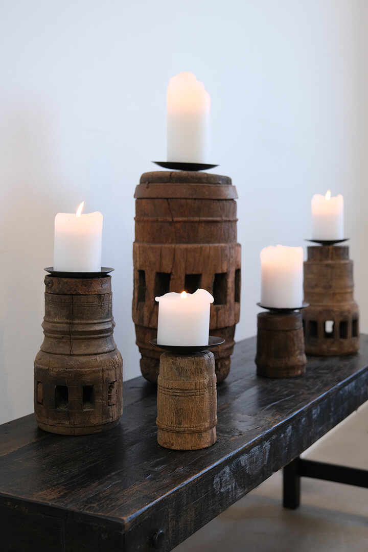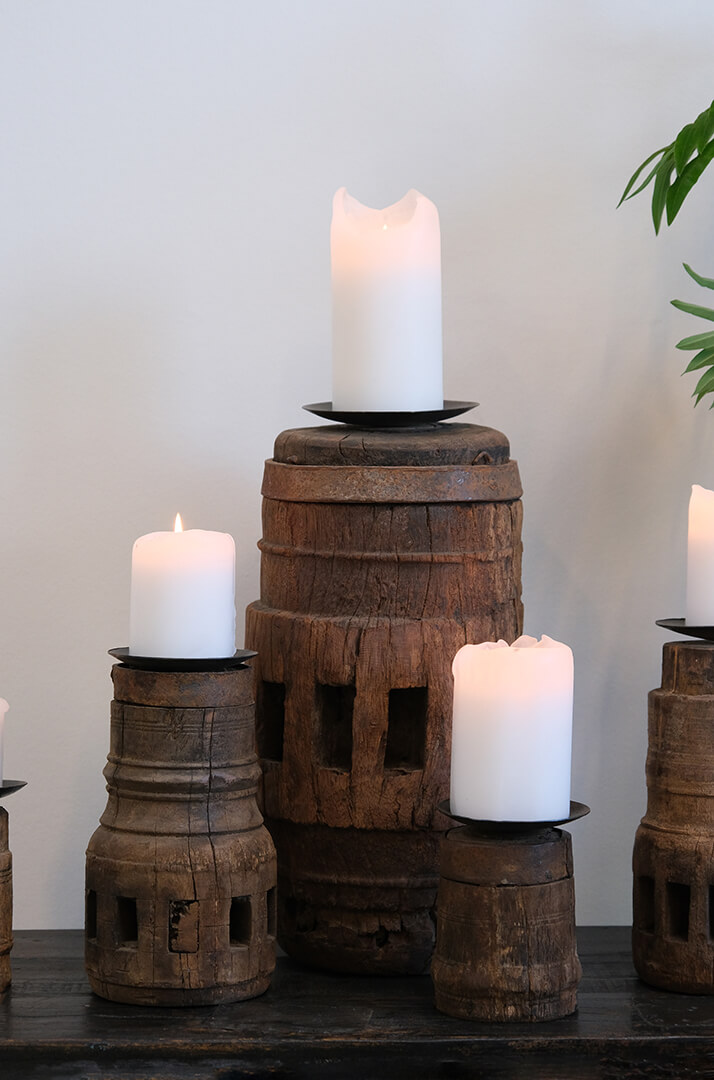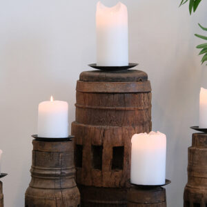 Pilu lysestagen i mellemstørrelse er fremstillet af et gammelt hjulnav i massivt træ og har en jernplade på toppen til lyset. Det udskårne mønster i træet giver stagen et unikt og dekorativt udtryk, hvor historiens spor tydeligt kan ses i overfladen. Den rå kombination af træ og metal passer perfekt ind i en rustik eller nordisk indretning. Lysestagerne er upcyclet fra forskellige træhjul og kan derfor variere i størrelse: Højde 20-25 cm. Diameter 12-15 cm.