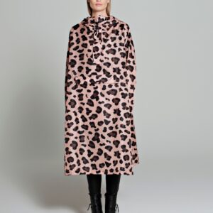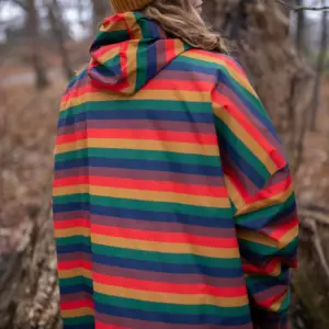 Foran er der en stor lomme som den kan foldes sammen i efter brug. Justerbar hætte med snoretræk, ærmer med velcrolukning og sidepaneler med 2 knapper der kan åbnes, hvilket er perfekt hvis du skal cykle.
