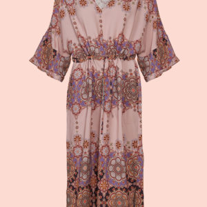 Nyere model fra duMilde etc. i et flot etnic print. Modellen har et let kaftan-udtryk med bindebånd, drop-shoulder ærmer med bred kantafslutning, lommer i sidesøm og slids på 19 cm i siderne. Modellen er dejlig rummelig og kan sagtens dække over 2 størrelser.