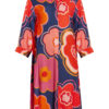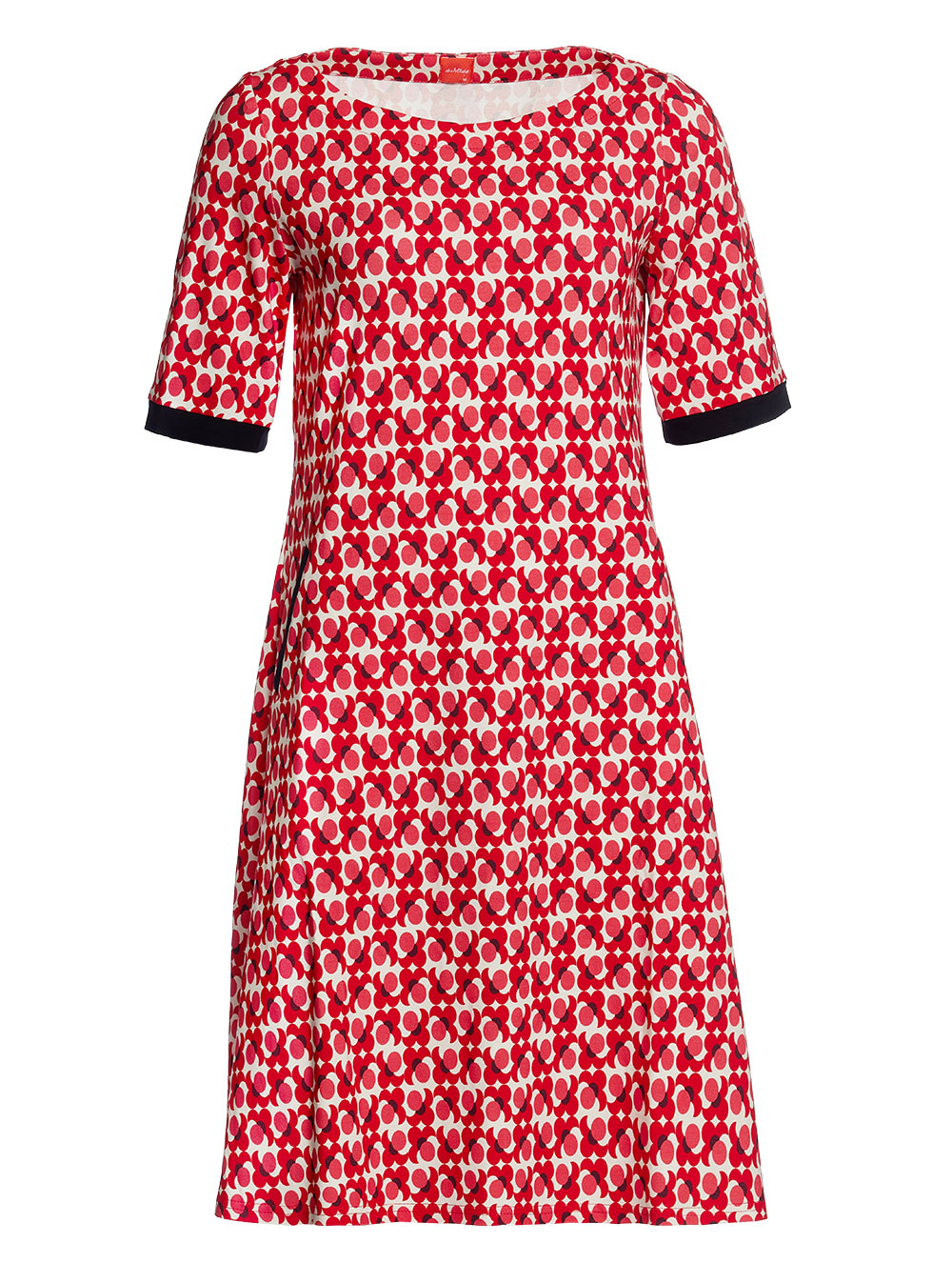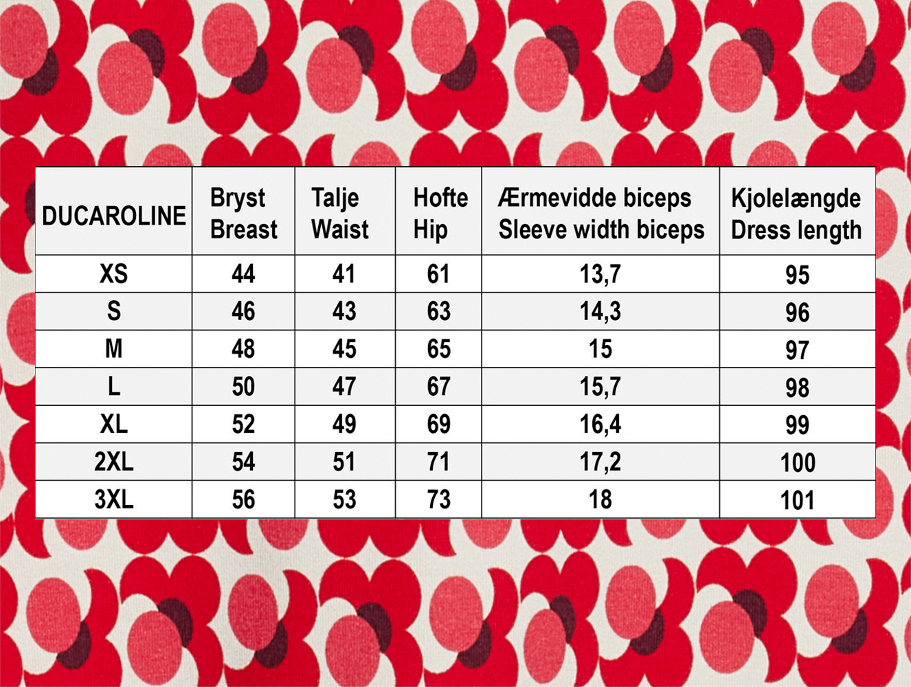Skøn kjole i smukt grafisk print i den populære Caroline model, som sidder til over barmen og falder blødt om mave og hofter. Kjolen har 3/4 ærmer som er afsluttet med lille sort kant og der er lommer i sidesøm. Den passer til rigtigt mange kvindekroppe, hvor den fremhæver barm og skjuler hofte, mave og numse. Bagpå i nakken sidder det flotteste håndhæklede sorte hjerte. Mega flot kjole –