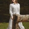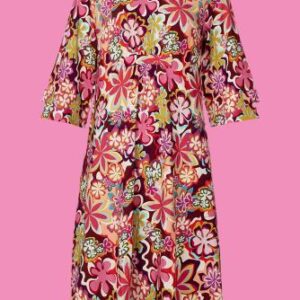 Det skønneste retro print på denne fine duMilde etc.kjole. Modellen bliver samlet under barm med små læg. Kjolen har lommer i sidesøm og “dypper” elegant i siderne. Ærmerne er bredde og 3/4 lange og har et flot spændetap.
