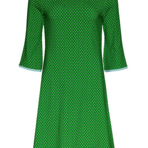 Prik prik i flere farver og størrelser på blå bund, giver flot effekt. Kjolen er let taljeret med A-facon. Der er stolpe-lukning i hals med krave i blå. Ærmer er rynket til bred manchet med hul/slids detalje.