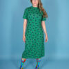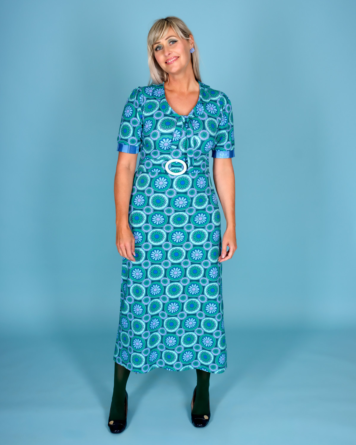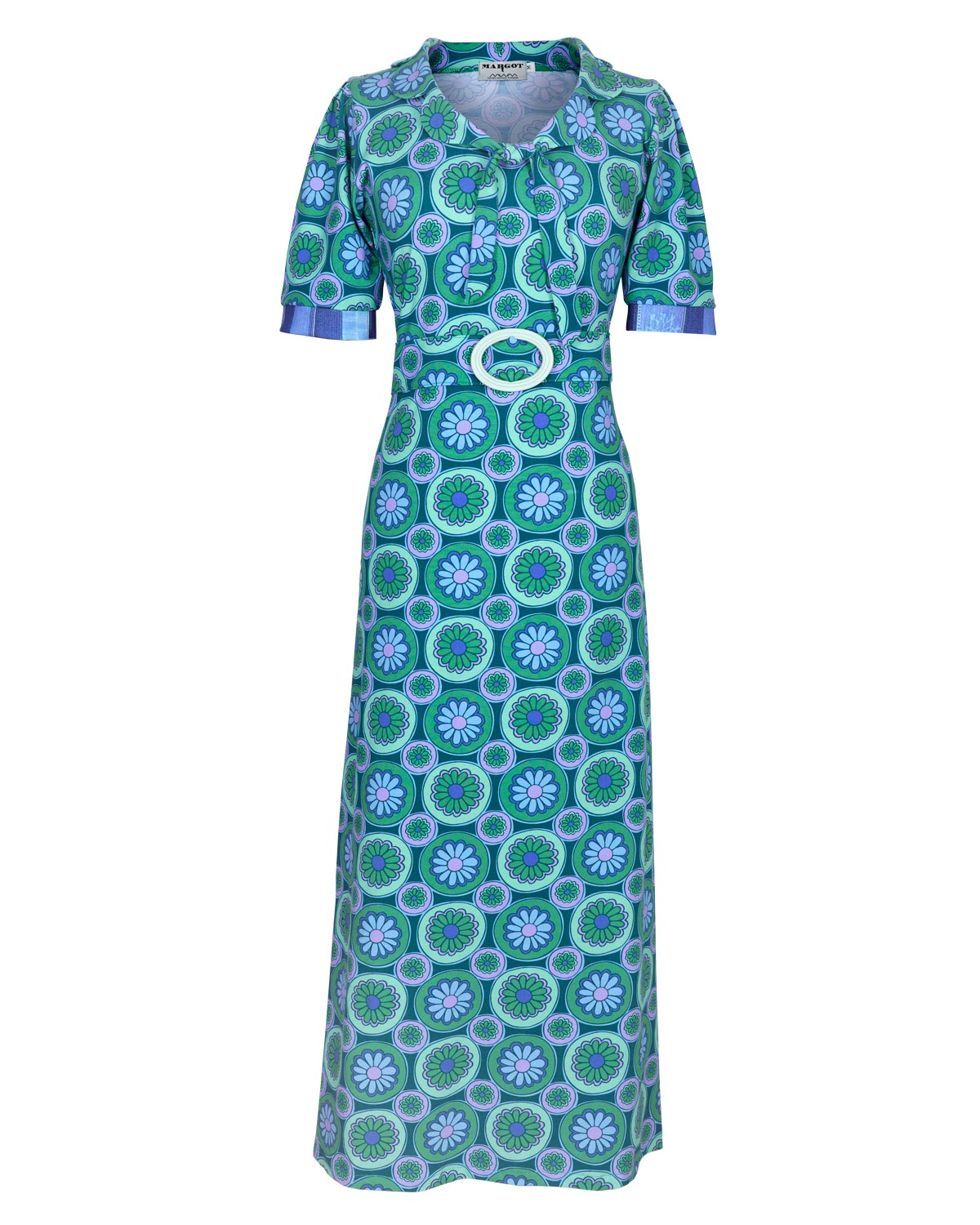 Super flot lang kjole i skønne grønne, blå og rosa farver med blomster og med empiresnit. Modellen har påsyet bælte med flot retro-spænde og ærmekanterne har manchet med ” jeanslook”. Kraven er lavet som en blomst med 2 snore som bindes foran. En kjole, der kan bruges til hverdag eller fest –  på stranden, med denimjakke, cardigan eller blazer – sneakers, stilletter eller sandaler. Alt er muligt med denne skønne sag.