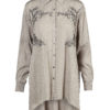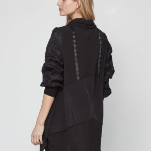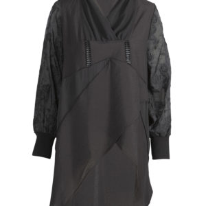 Fantastisk tunika med et spil af forskellige sammensætninger af materialer i struktur og vævning. Modellen har V-hals med fin drapering. Skæringer på skrå med løs overfald. Pyntebånd fra hals til “empire”-skæring. Slidset i siden og længere bagpå. Ærmer med rynk til rib-manchet.