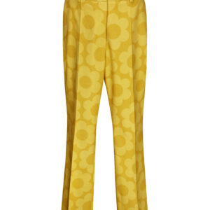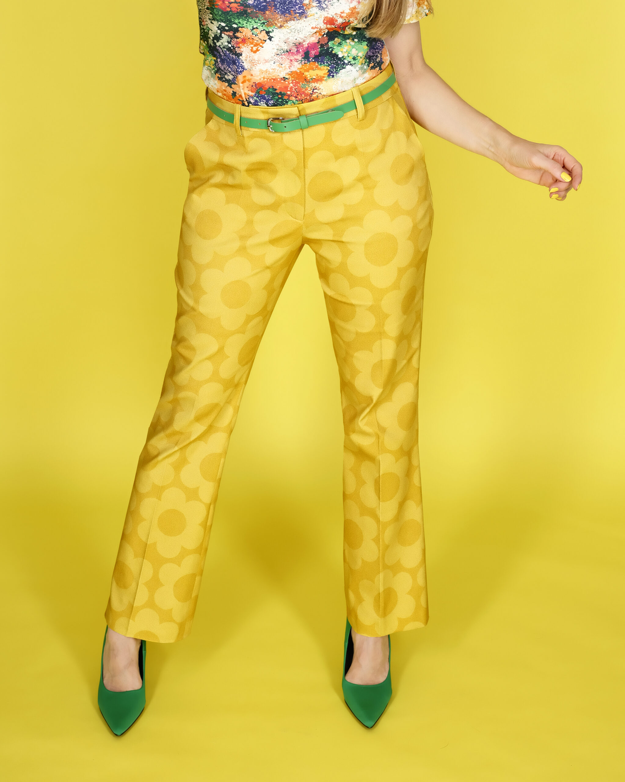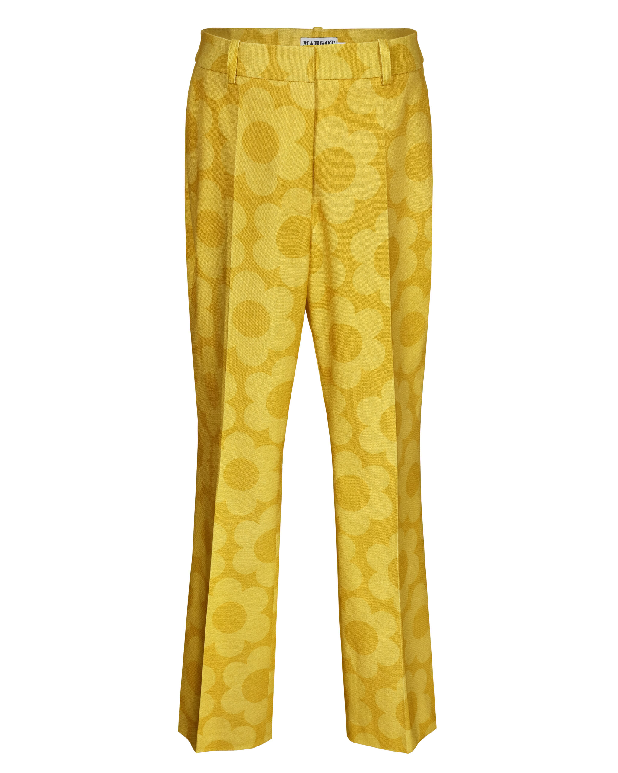 Skøn buks i klassisk snit i gul med blomster print . Buksen har skrå lommer, bred linning, pressefolder og pyntelommer med knap bagpå.