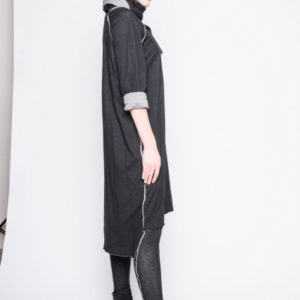 Super skøn tunika/kjole i lækker kvalitet. Modellen er i dobbelt knit med grå bagside og mere længde bagpå. Syet med rå udadvendte sømme og kanter, som viser kontrasten.
