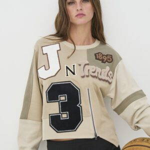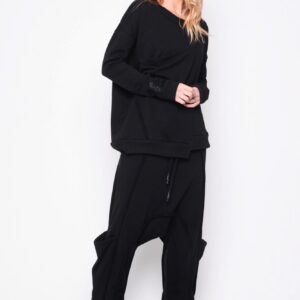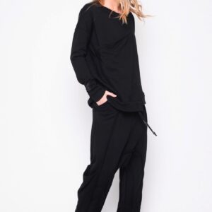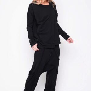 Mega flot og anderledes sweat bluse med en kæmpe lomme foran og ribkant strik på alle kanter også i kraven. Blusen har dropshoulder med ekstra lange ærmer og har flere steder asymmetriske afslutninger som gør den virkelig spændende at se på. Det kan godt være lidt svært at se på billedet 🙂