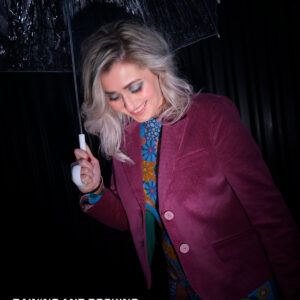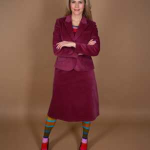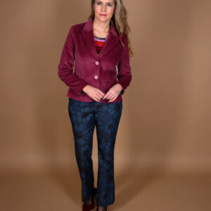 Figursyet vinrød blazerjakke i fløjl. Modellen har revers, lommer med lommeklapper samt brystlomme.