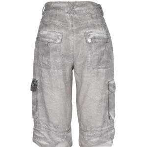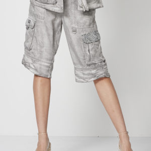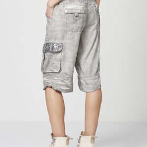 Bermuda shorts i lækker blødt materiale i “cold dye” med rigtig mange rå design detaljer. Modellen har fast linning og bæltestropper samt 2 gode lommer i siden. Buksen har lynlås lukning og 2 flotte rå metaltrykknapper som lukning. Buksen har et væld af lommer, hurraaa 🙂 lommer bagpå, påsatte lommer med dobbelt lomme i en og en lomme med rå metal lynlås samt pailletter.