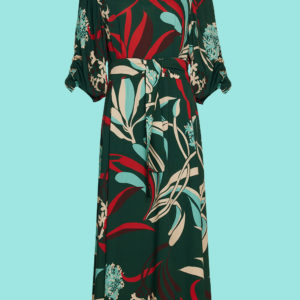 Lang kjole med flot flow i skørt og aftagelig bindebånd i skønne skønne farver. Kjolen er skåret under brystet i let buet facon med fine læg som brystindsnit. Elastik i ryggen som gør at kjolen sidder perfekt. Ærmerne er vide med elastik kant forneden samt draperet effekt op langs ærmet. Brug kjolen til hverdag eller fest – den kan det hele
