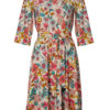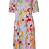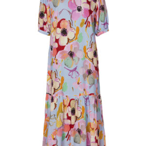 Lang kjole med v-hals og ærmer med manchetkant og en flot bred feminin flæsekant forneden. Det er rigtig fint med lange kjoler da de kan bruges både til hverdag og fest.